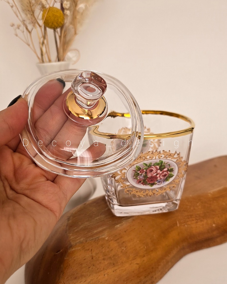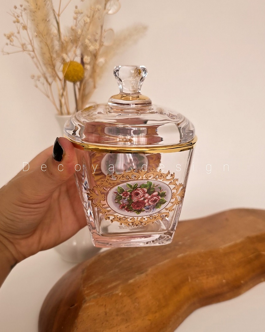 قندان گلدار لب طلایی استرلینگ یکی از پرفروشترین قندانهای بلوری در بازار حال حاضر کشور است که می توان به عنوان شکلات خوری هم استفاده شود